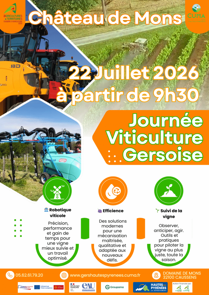 Le réseau CUMA (Gers et Hautes-Pyrénées) et la Chambre d’Agriculture du Gers organise une journée technique le 22 juillet 2026, dès 9h30. Cet événement sera dédié à l’optimisation des pratiques viticoles autour de trois thématiques clés :