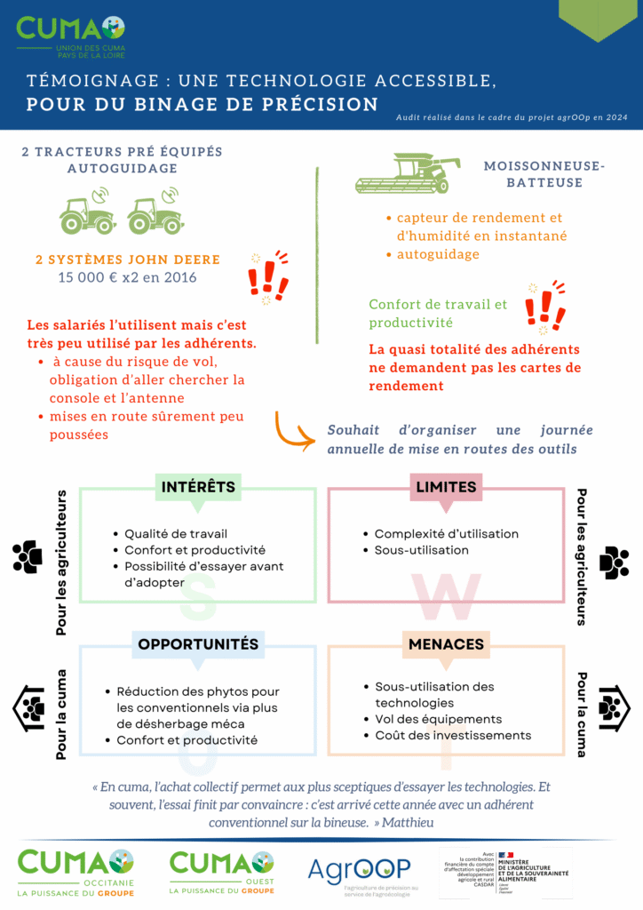 En intégrant ces innovations, la cuma Loire Beconnais montre la voie à suivre pour une agriculture plus précise, productive et respectueuse de l’environnement. Dans le cadre du projet Agroop, qui vise à promouvoir des pratiques agricoles innovantes et durables, cette cuma participe à un réseau plus large d’échanges et de démultiplication des bonnes pratiques agricoles.