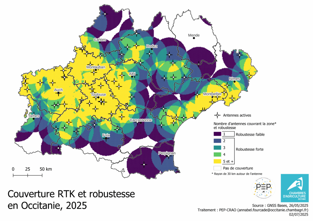 La couverture est cependant très inégale entre les départements : les zones de grandes cultures utilisant notamment le RTK pour certains chantiers comme le désherbage mécanique, l’autoguidage ou la mise en place de solutions d’agriculture de précision pouvant nécessiter une précision centimétrique, sont mieux couvertes.
