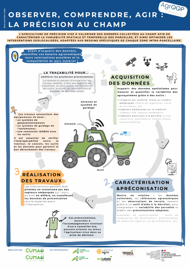 Ce panneau a été réalisée dans le cadre du projet agrOOP visant à démultiplier les solutions d’agriculture de précision au service de l’agroécologie, par le réseau Cuma Occitanie et Ouest ainsi que la Chambre d’agriculture de Bretagne et Terrena.